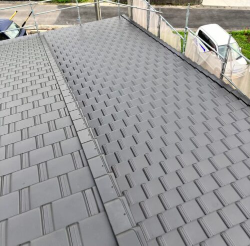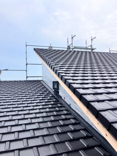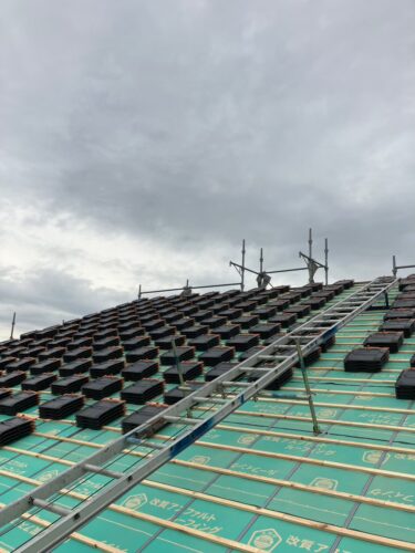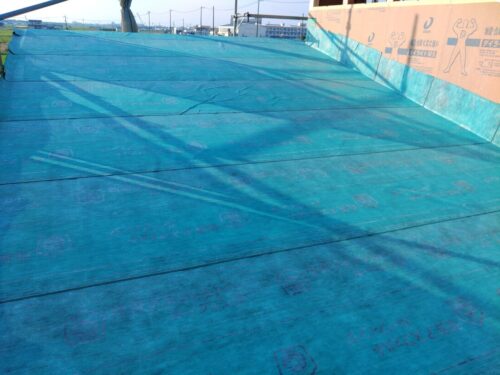 新築屋根なので、大工さんが施工された屋根下地に防水シートを施工する工程からスタートです